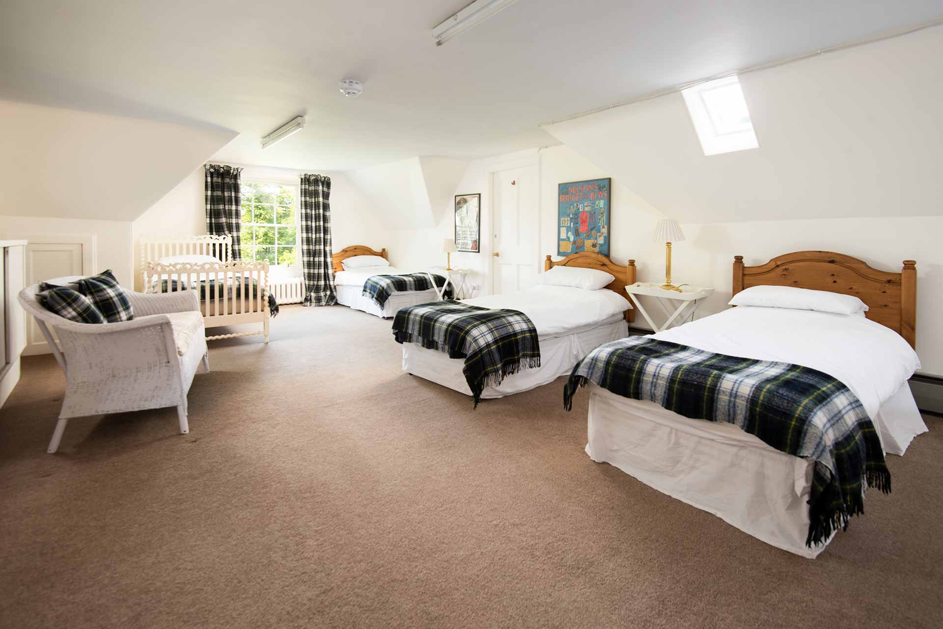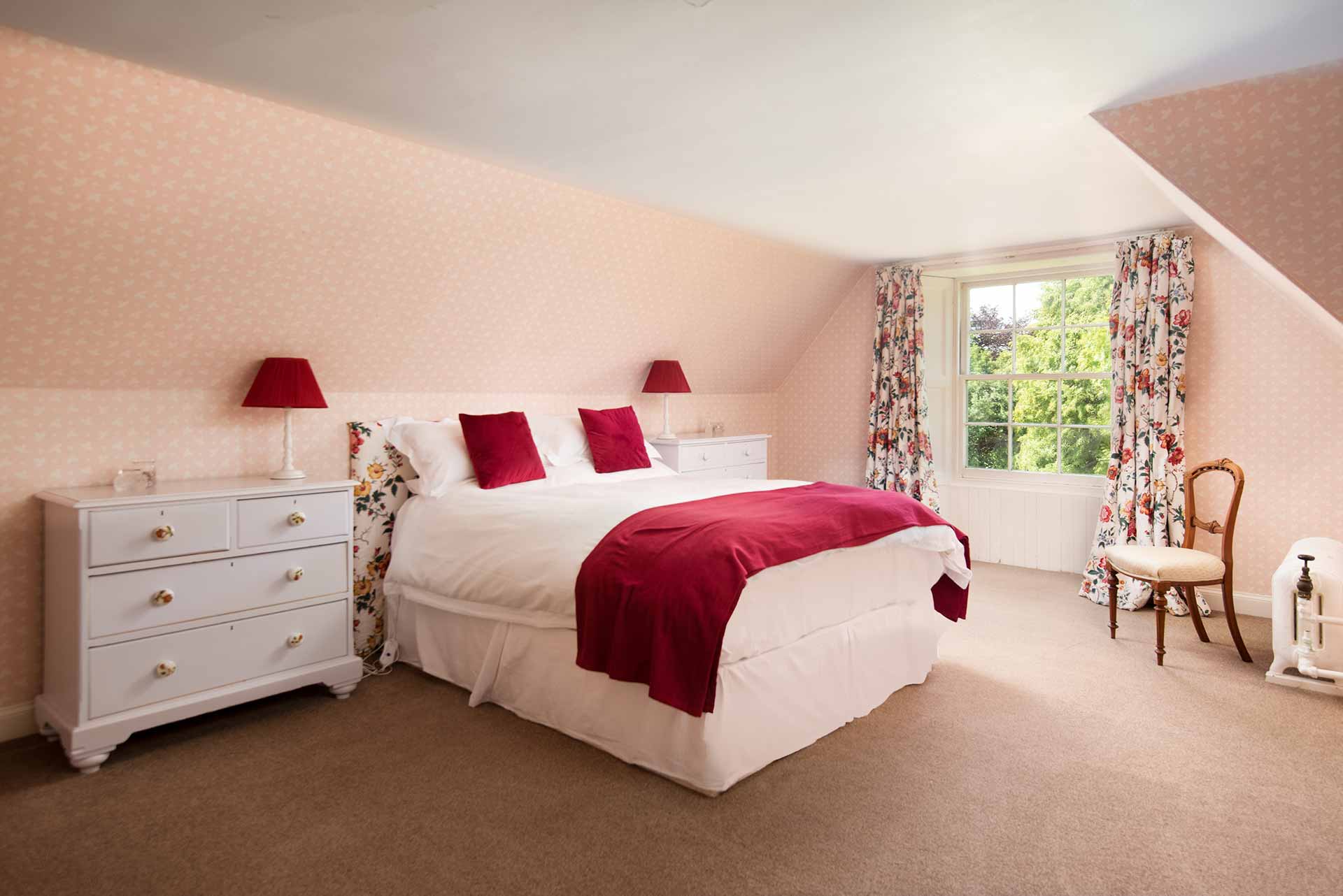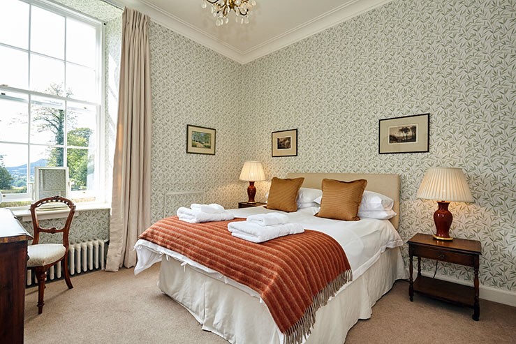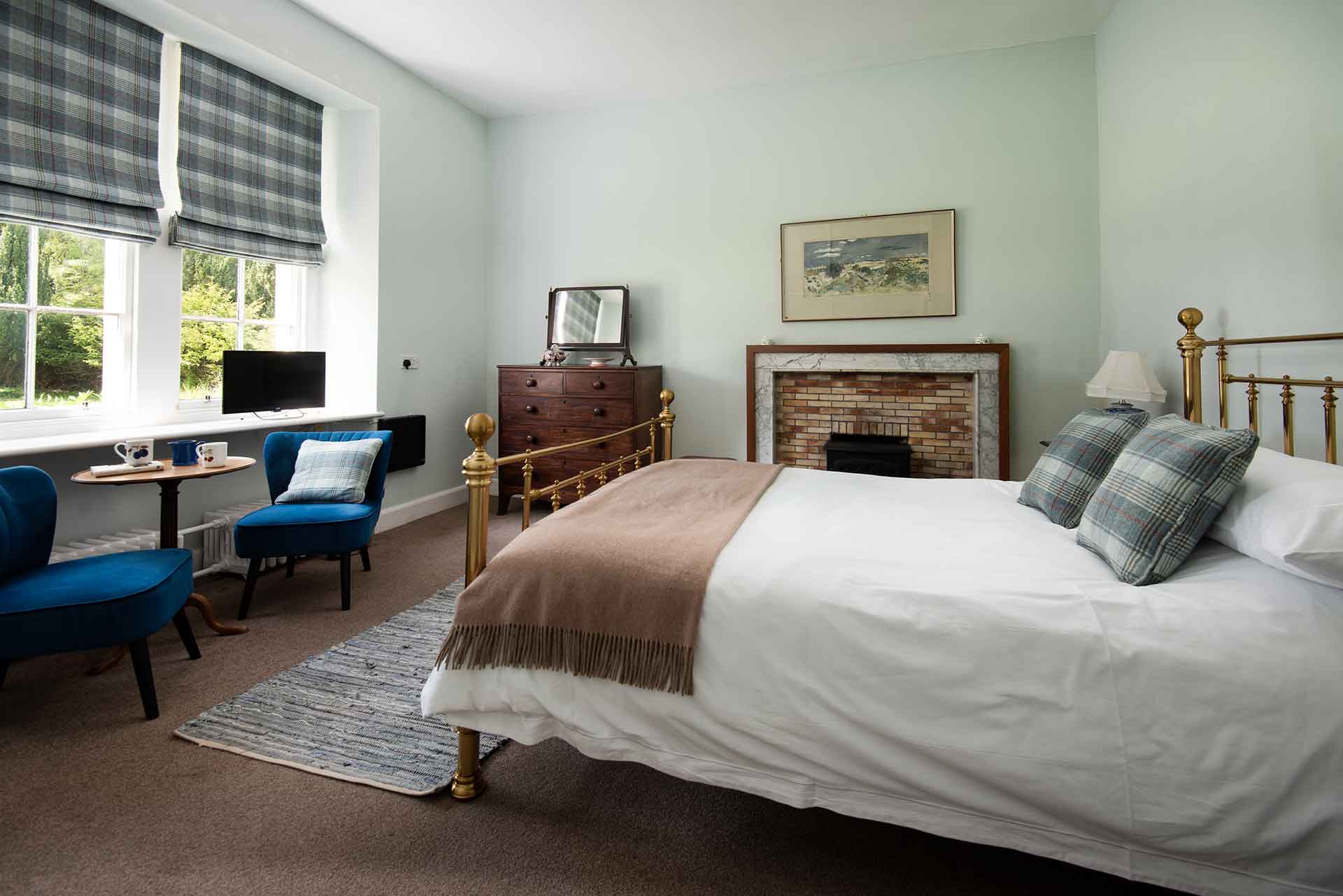 Each bedroom has its own personality — some with canopy beds and open fireplaces, others tucked into the eaves with views over the Tweed.